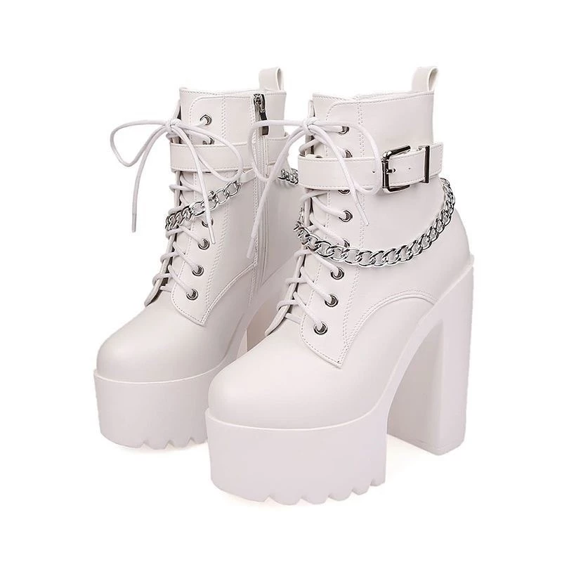 รองเท้าบูทสั้นส้นตึกสูง 14.5 cm. เสริมหน้า 2 นิ้ว แต่งโซ่ มีซิป
